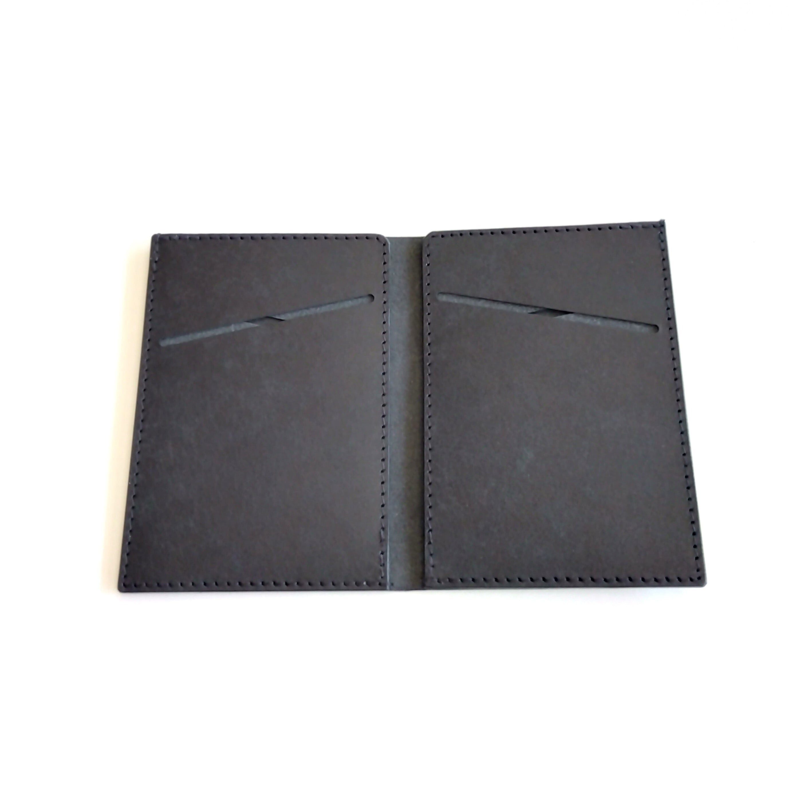 「極薄革の両面カードケース2枚用」を二つ繋げた形になっており、斜めのスリットを表裏両面に開けてありますので、カード4枚の他に多用途に使えるポケットが2か所も出来てしまいました。
